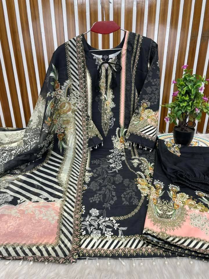 ডিজাইনঃ ডিজিটাল প্রিন্টের সাথে লেসের কাজ করা সম্পূর্ণ রেডিমেড থ্রি পিস।
