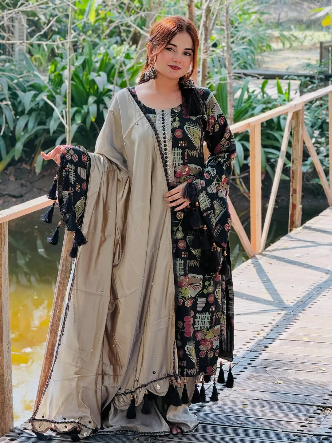 ডিজিটাল প্রিন্টের লেস ওয়ার্ক ডিজাইনের রেডিমেড থ্রি পিস