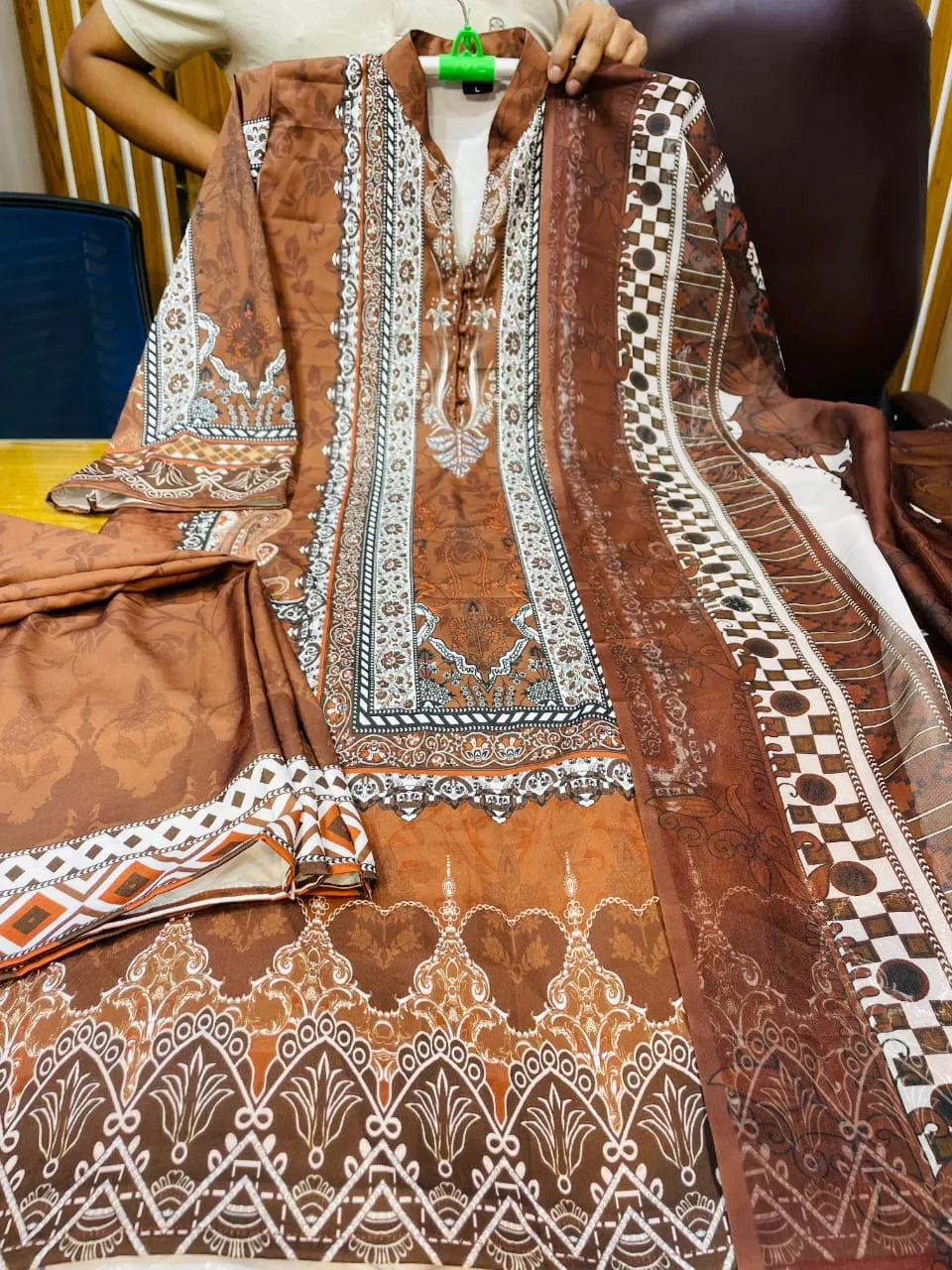 ডিজাইনঃ ডিজিটাল প্রিন্টের সাথে লেসের কাজ করা সম্পূর্ণ রেডিমেড থ্রি পিস।