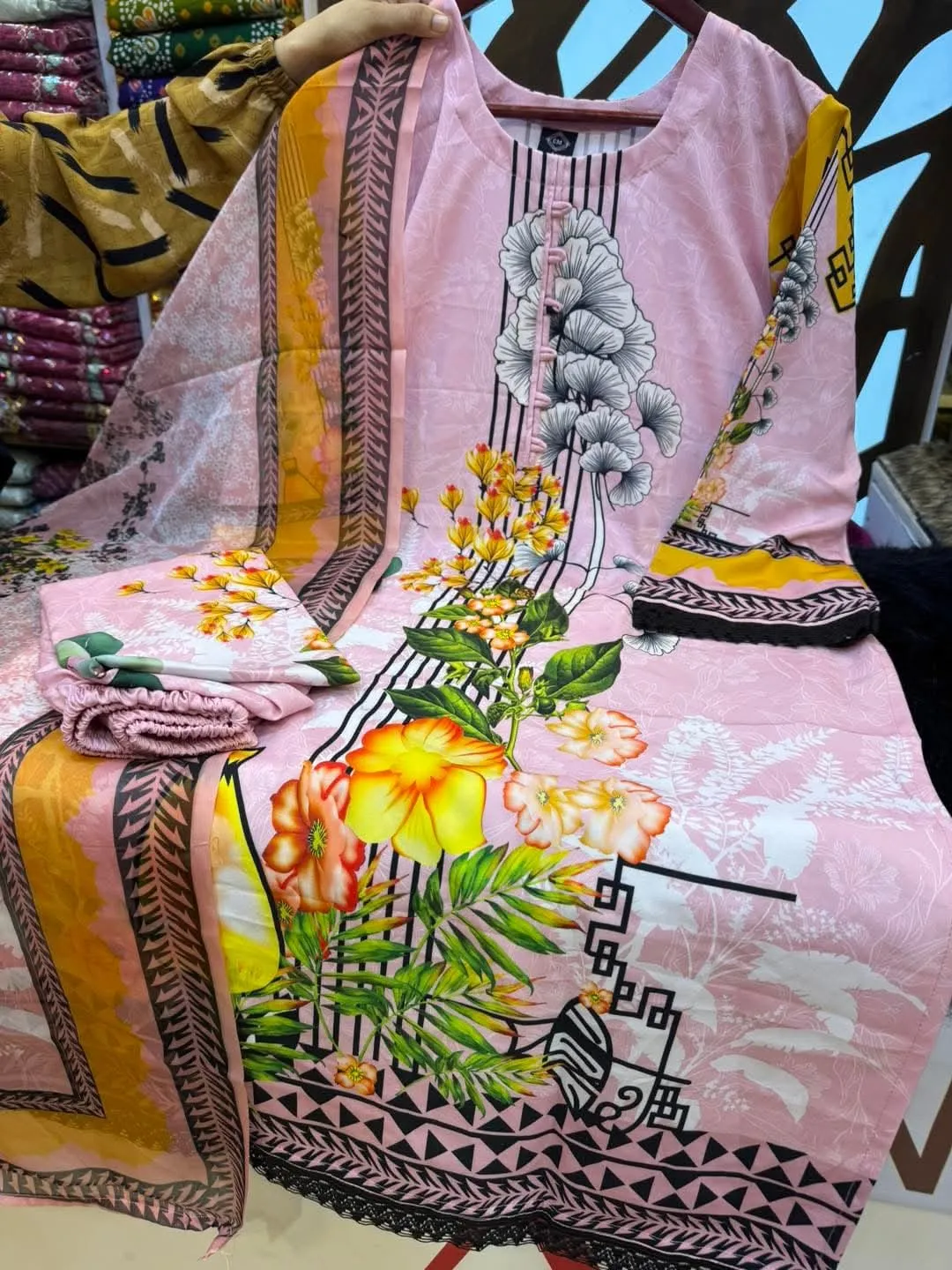 ফেব্রিক্সঃ কামিজ অ্যান্ড প্যান্টের ফেবরিক মাইকো স্ট্রিজ। ওড়না জর্জেট।