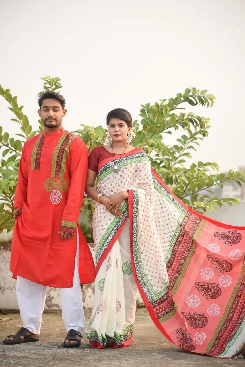 সুতি শাড়ী ও স্লাব কটন পাঞ্জাবিকাপল সেট