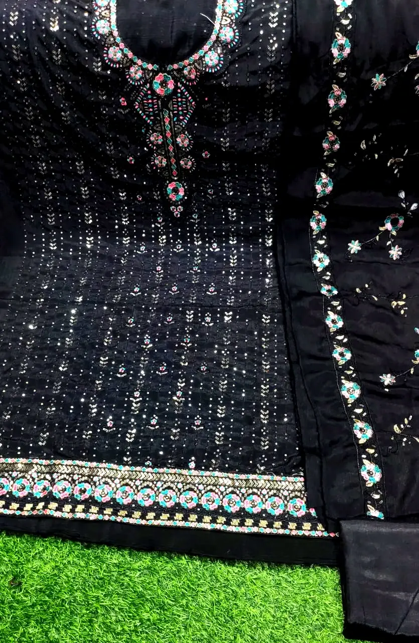 জামার ফুল বডিতে হেব্বি এম্বুডারি ও সিকুয়েন্স কাজ করা।