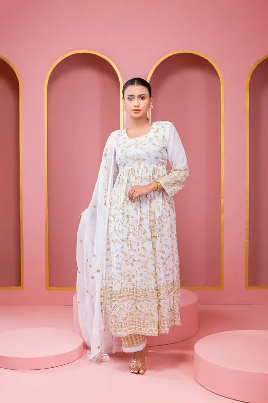 সেমী স্টিচড জর্জেট এমব্রয়ডারি লং ফ্লোর টাচ আনারকলি পার্টি ড্রেস